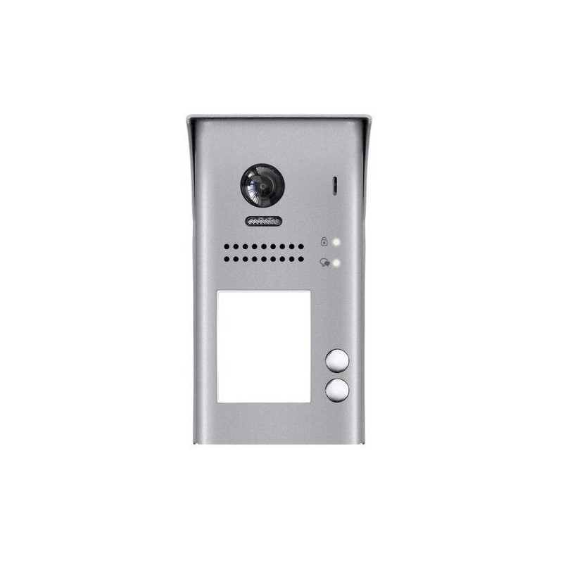 Dveřní stanice pro víceúčastnickou instalaci s přímou tlačítkovou volbou. 2x zvonek. Barevná kamera, CCD 1/3", širokoúhlý objektiv 105°, reproduktor. Ovládání jednoho zámku. Venkovní, stupeň krytí IP54, povrchová montáž.
